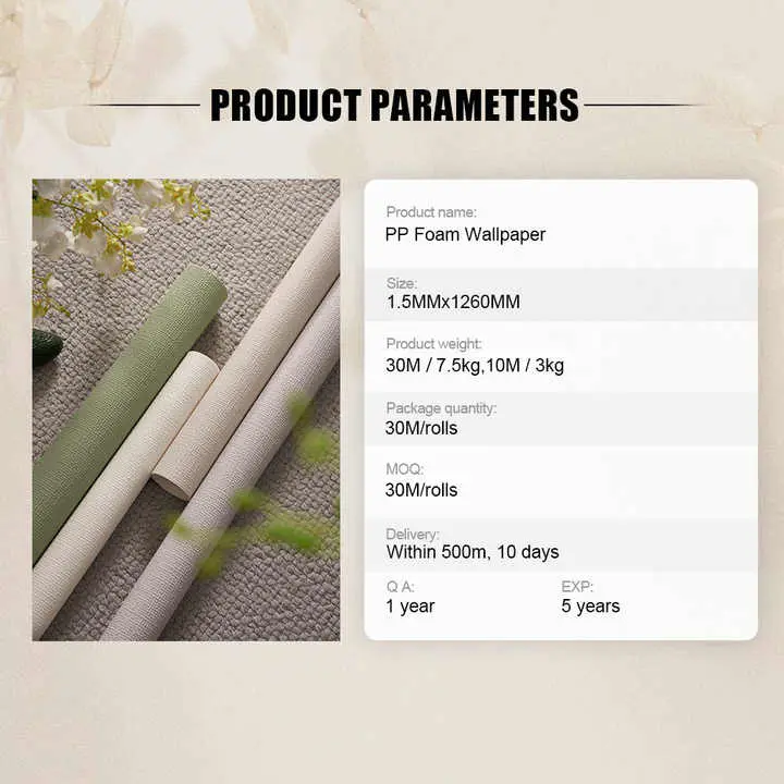 · ಬಹು-ಕ್ರಿಯಾತ್ಮಕ ಪ್ರಯೋಜನಗಳು: ಈ ವಾಲ್ಪೇಪರ್ ಸ್ಥಿರ ವಿರೋಧಿ ಗುಣಲಕ್ಷಣಗಳು, ಶಾಖ ನಿರೋಧನ ಮತ್ತು 1 ವರ್ಷದ ಖಾತರಿ ಸೇರಿದಂತೆ ಹಲವಾರು ಪ್ರಯೋಜನಗಳನ್ನು ನೀಡುತ್ತದೆ, ಬಳಕೆದಾರರಿಗೆ ಮನಸ್ಸಿನ ಶಾಂತಿ ಮತ್ತು ಅವರ ಒಳಾಂಗಣ ವಿನ್ಯಾಸದ ಅಗತ್ಯಗಳಿಗೆ ದೀರ್ಘಕಾಲೀನ ಪರಿಹಾರವನ್ನು ನೀಡುತ್ತದೆ.